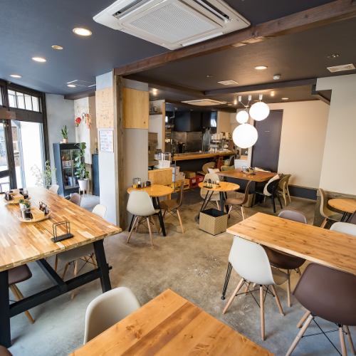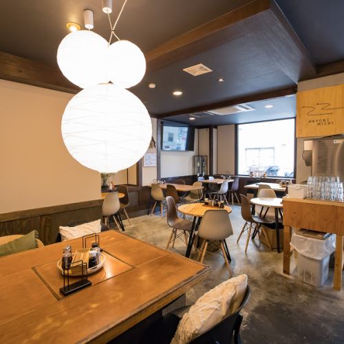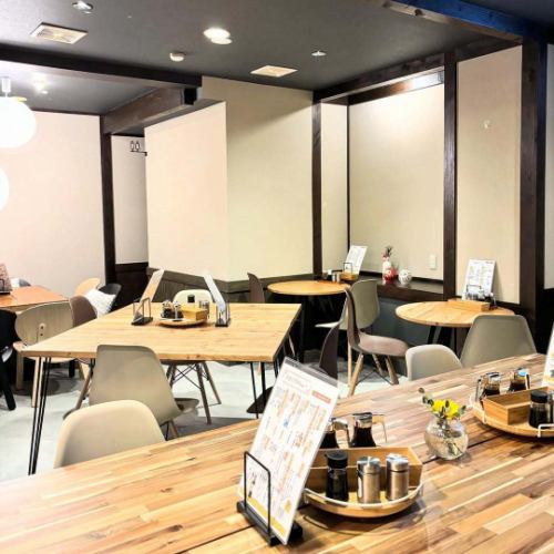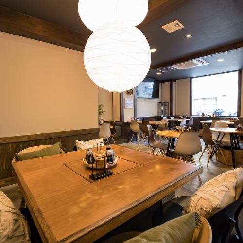 店内は、木目のテーブルと白やグレーの椅子を基調とした、和風で落ち着いた雰囲気の空間です♪温かい光を放つ照明や、可愛らしい小物が飾られており、大人の隠れ家のような落ち着いた雰囲気◎ごゆっくり寛ぎながらお過ごしいただけます!